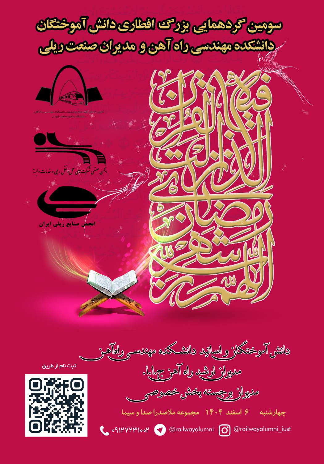 انجمن دانشآموختگان دانشکده مهندسی راهآهن دانشگاه علم و صنعت ایران با مشارکت انجمن صنفی شرکتهای حملونقل ریلی و خدمات وابسته و انجمن صنایع ریلی، سومین گردهمایی افطاری فعالان صنعت ریلی کشور را برگزار میکند.